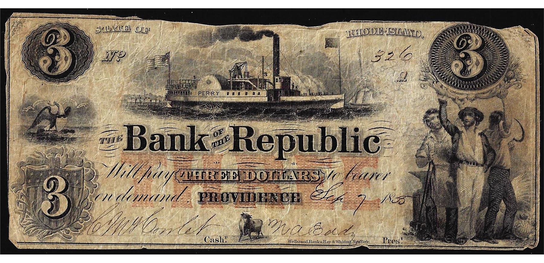 One 1855 $3 The Bank of the Republic Providence, Rhode Island Obsolete Note.