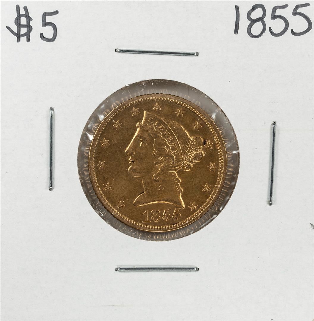 One 1855 $5 Liberty Head Half Eagle Gold Coin.