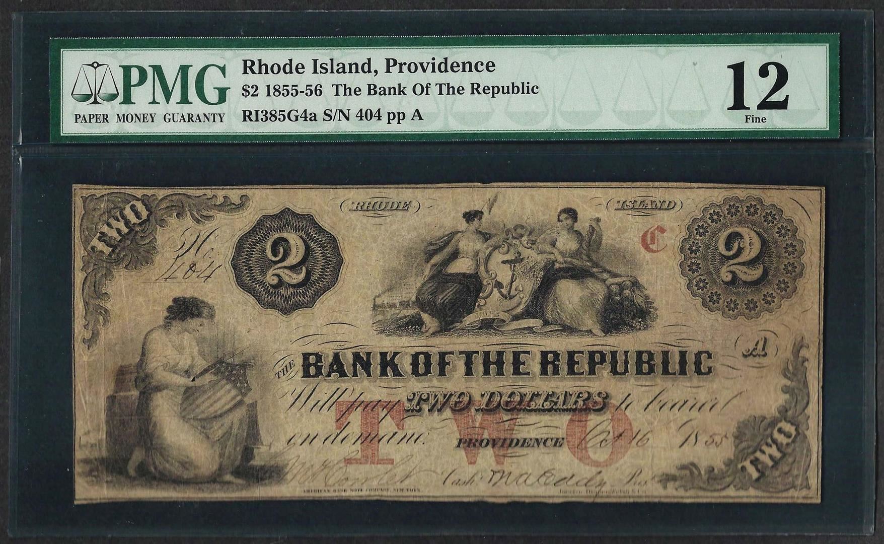 One 1855-56 $2 The Bank of the Republic Obsolete Note PMG Fine 12. PMG Certified.