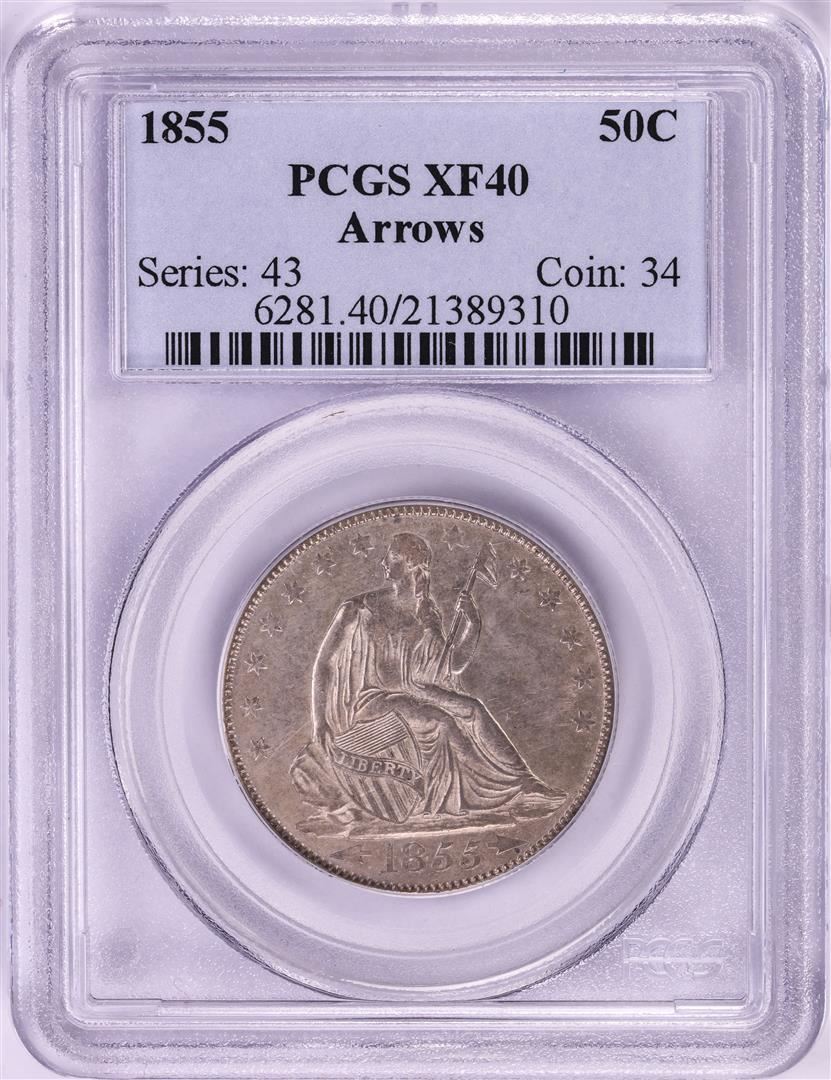 One 1855 Arrows Seated Liberty Half Dollar Coin PCGS XF40. PCGS Graded.
