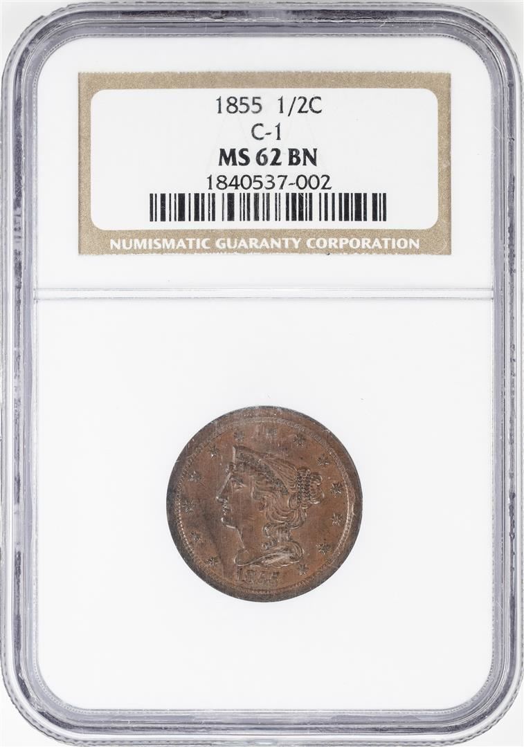 One 1855 Braided Hair Half Cent Coin NGC MS62 BN. NGC Certified.