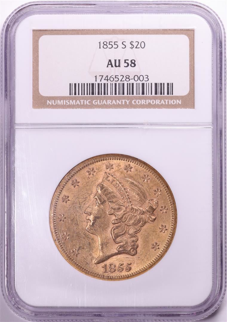 One 1855-S $20 Liberty Head Double Eagle Gold Coin NGC AU58. NGC Certified.