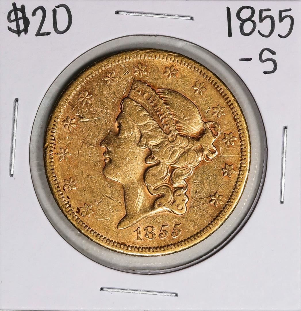 One 1855-S $20 Liberty Head Double Eagle Gold Coin.