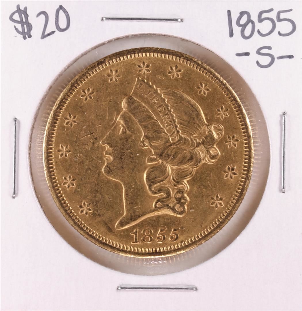 One 1855-S Type 1 $20 Liberty Head Double Eagle Gold Coin.