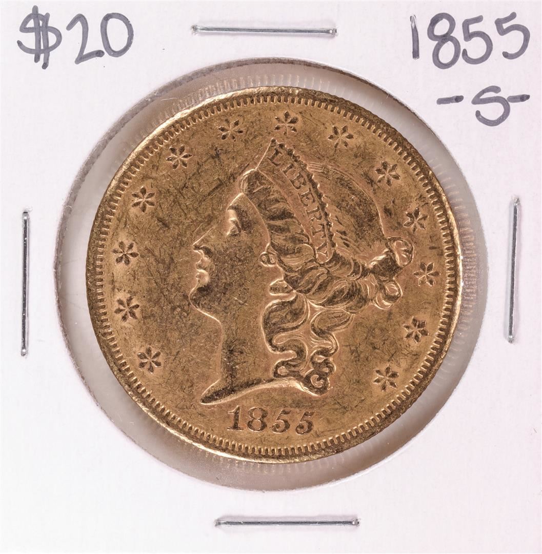 One 1855-S Type 1 $20 Liberty Head Double Eagle Gold Coin.