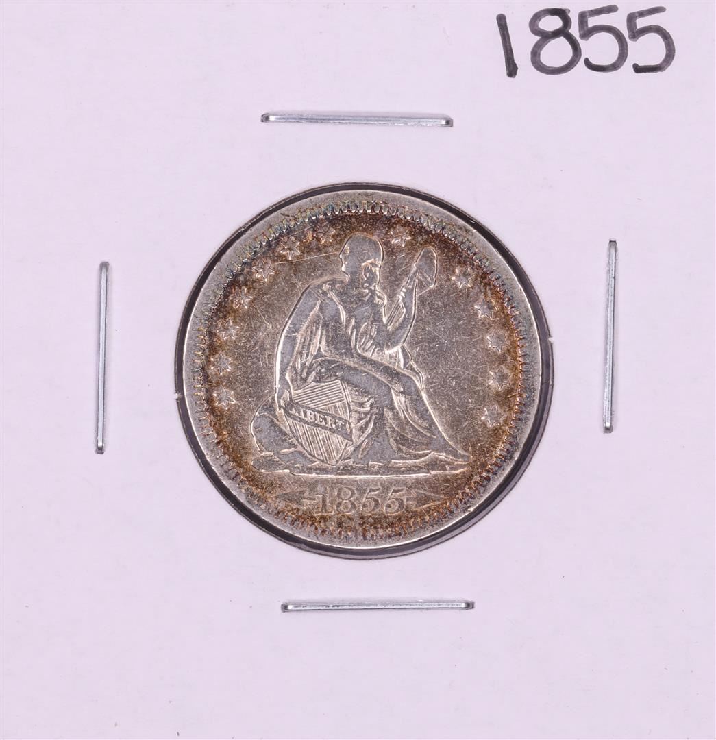 One 1855 Seated Liberty Quarter Coin.