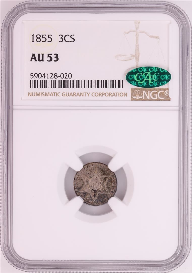 One 1855 Three Cent Piece Coin NGC AU53 CAC. NGC Certified.