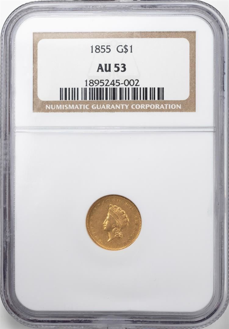 One 1855 Type 2 $1 Indian Princess Head Gold Dollar Coin NGC AU53. NGC Certified.
