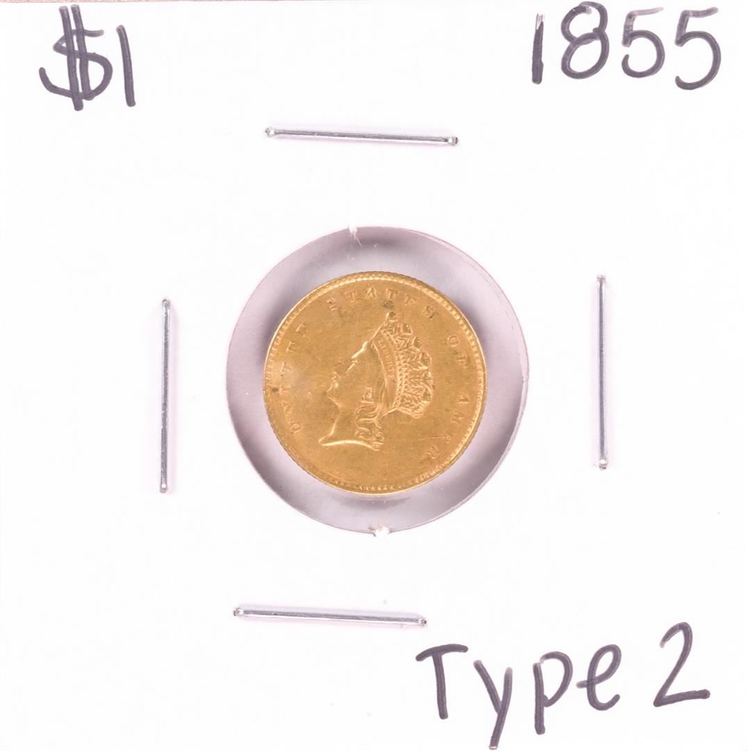 One 1855 Type 2 $1 Liberty Head Gold Dollar Coin.