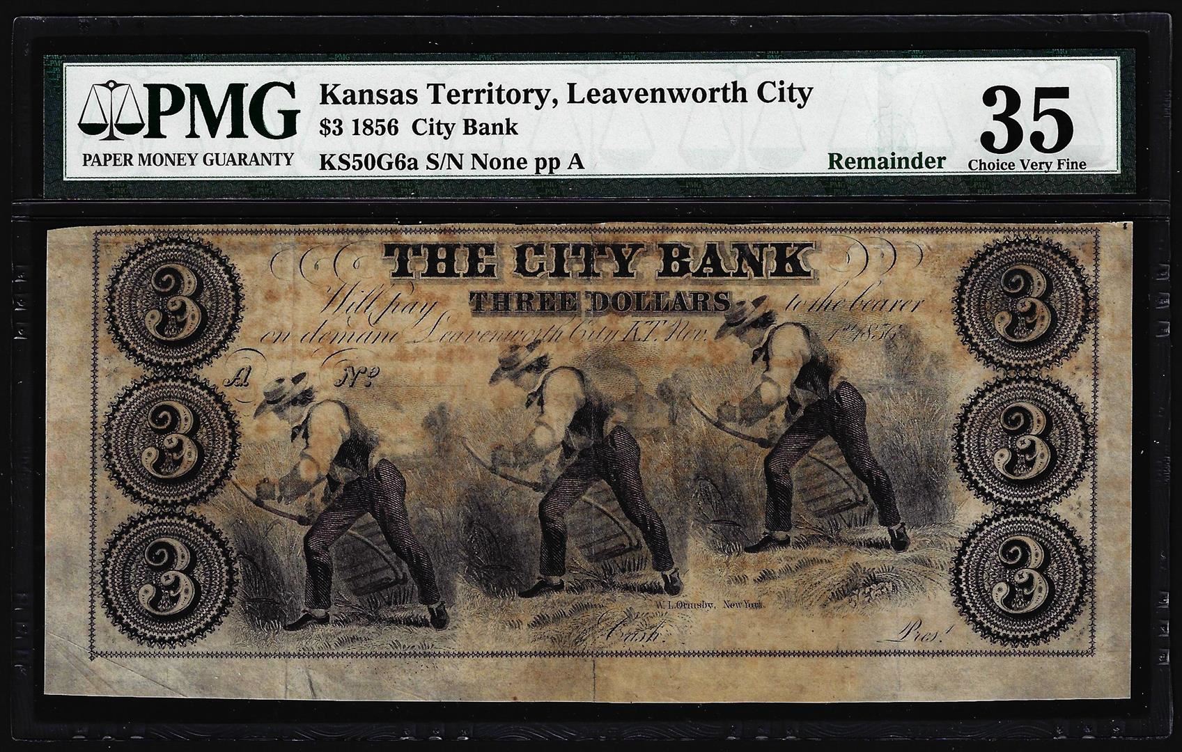 One 1856 $3 The City Bank Leavenworth City, KT Obsolete Note PMG Choice Very Fine 35. PMG Certified.