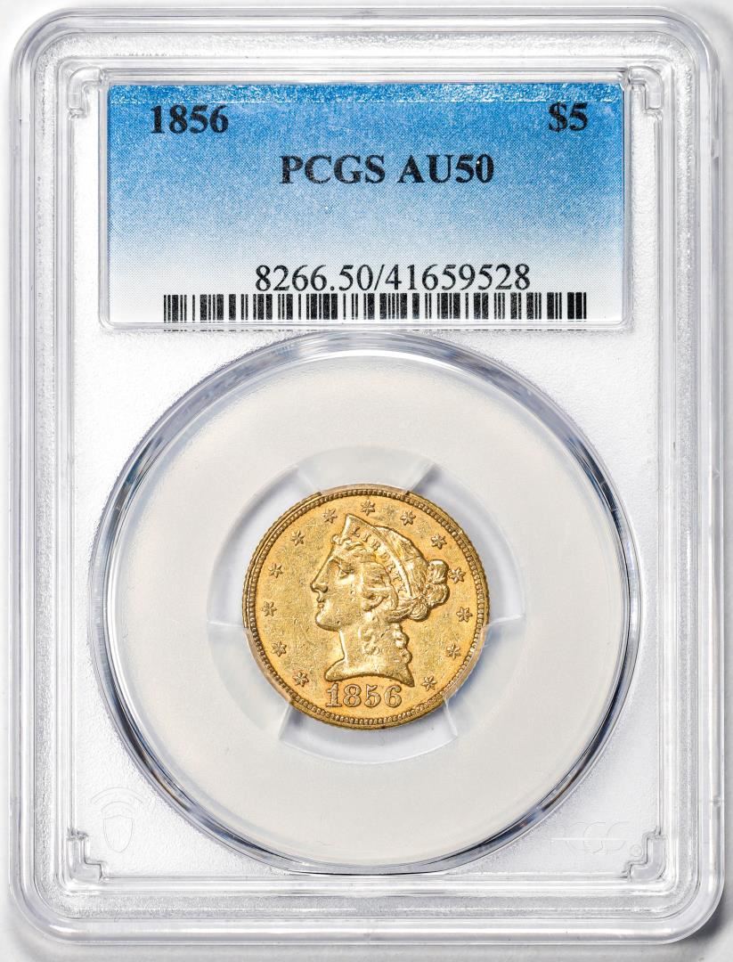 One 1856 $5 Liberty Head Half Eagle Gold Coin PCGS AU50. PCGS Graded.