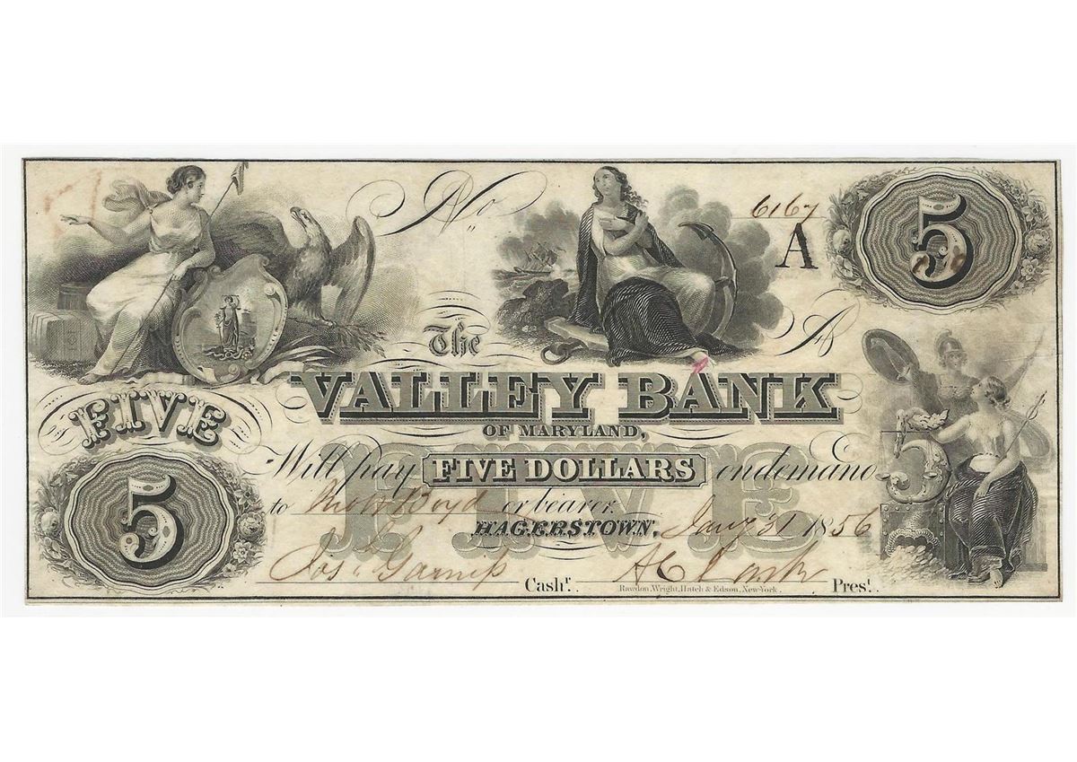 One 1856 $5 The Valley Bank of Maryland Obsolete Bank Note.