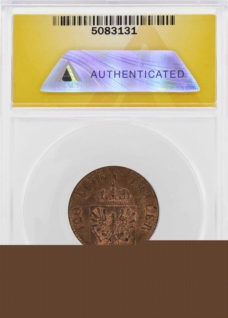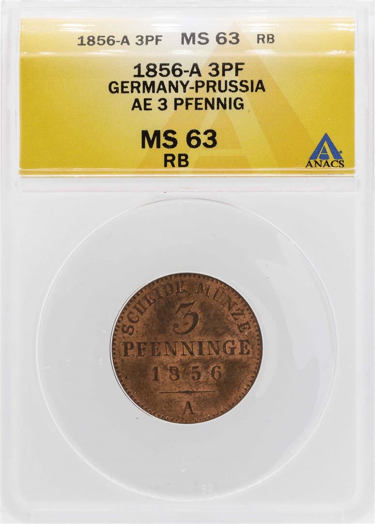 One 1856 Germany-Prussia AE 3 Pfennig Copper Coin ANACS MS63RB. ANACS Certified.