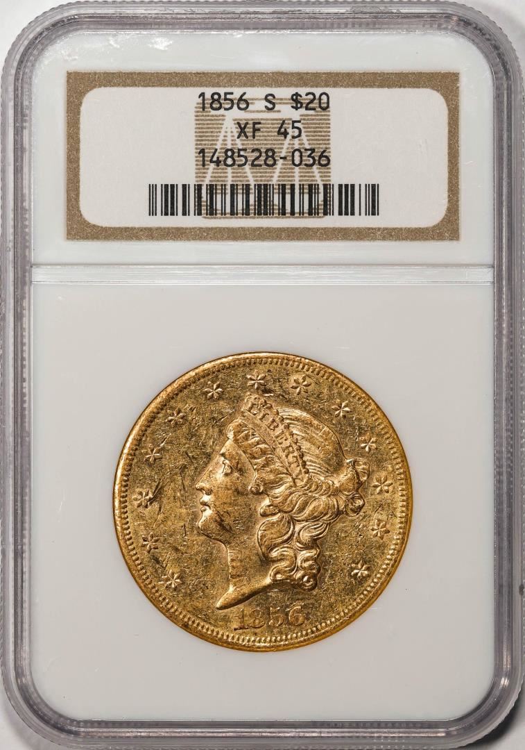 One 1856-S $20 Liberty Head Double Eagle Gold Coin NGC XF45. NGC Certified.