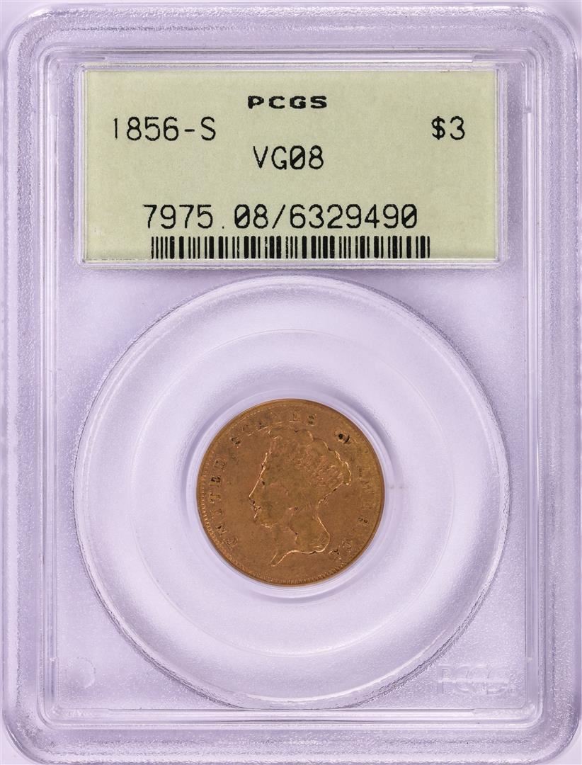 One 1856-S $3 Indian Princess Head Gold Coin PCGS VG08. PCGS Graded.