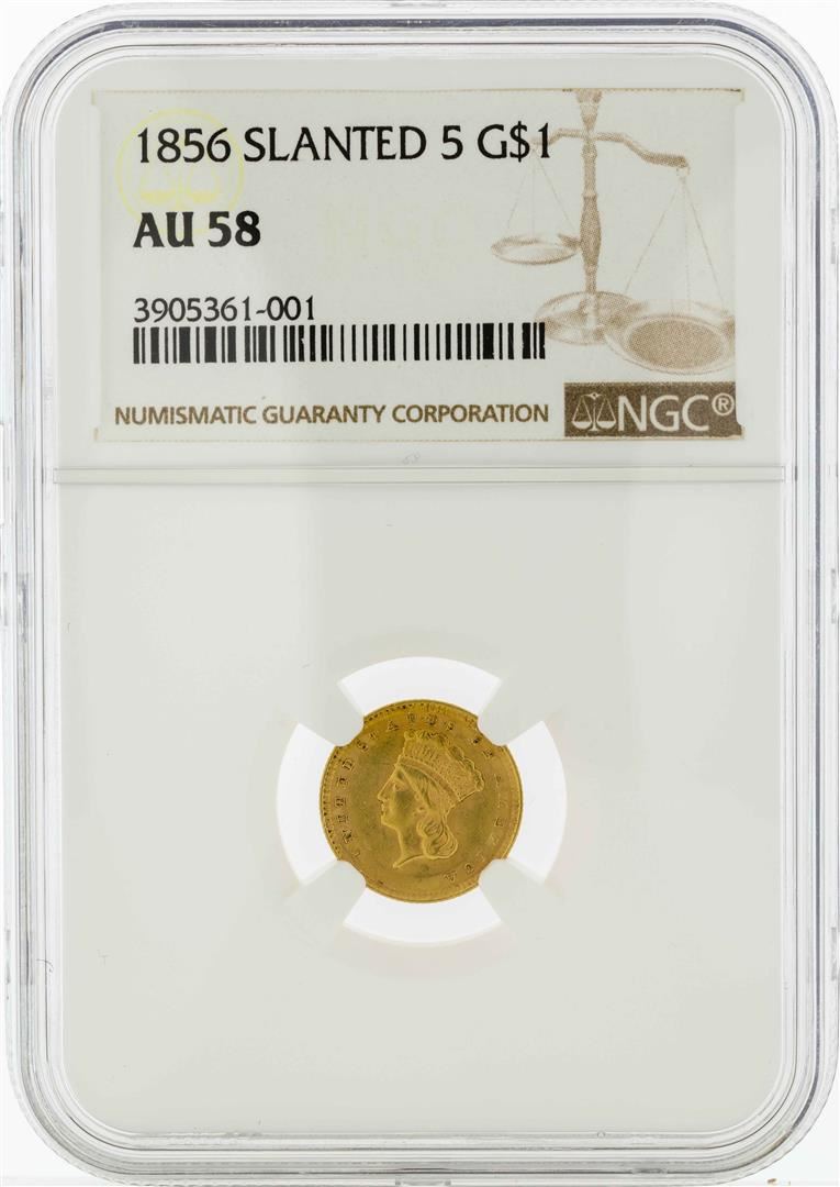 1856 Slanted 5 $1 Indian Princess Head Gold Dollar Coin NGC AU58