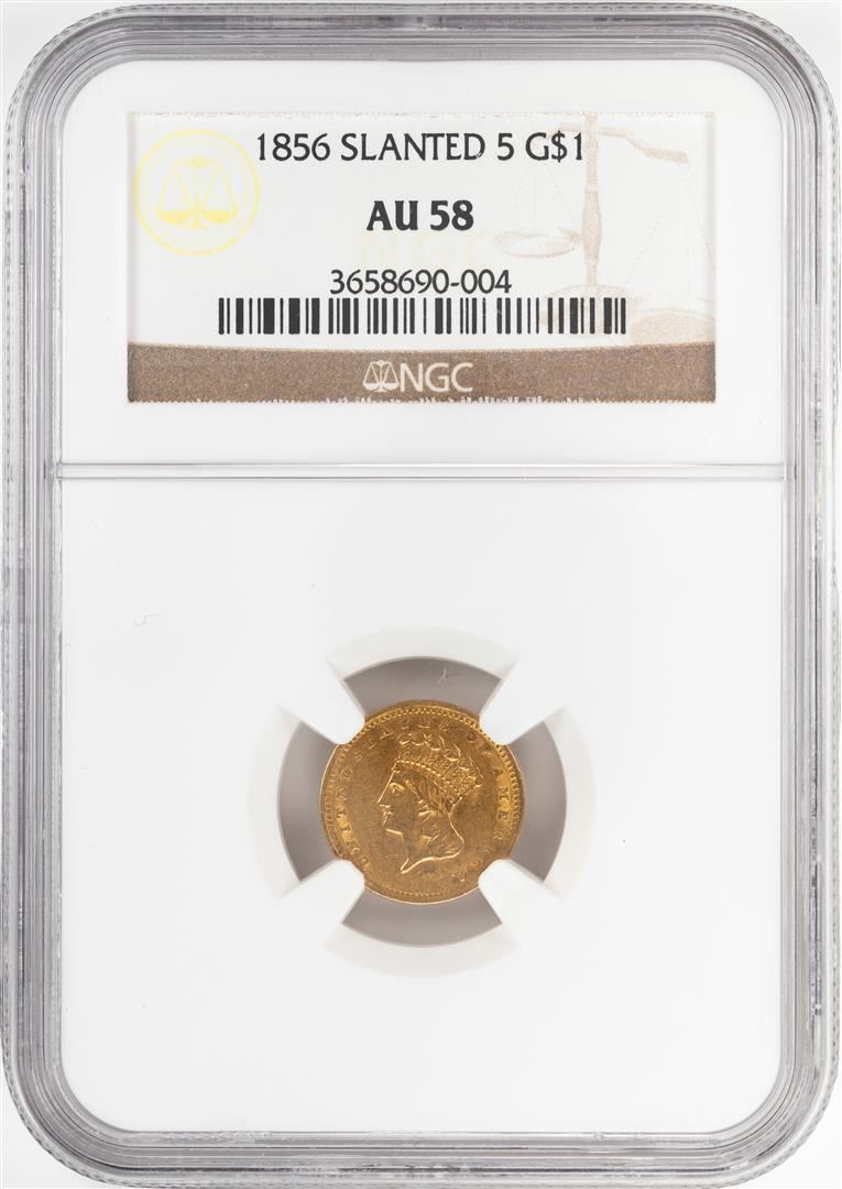 1856 Slanted 5 $1 Indian Princess Head Gold Dollar Coin NGC AU58