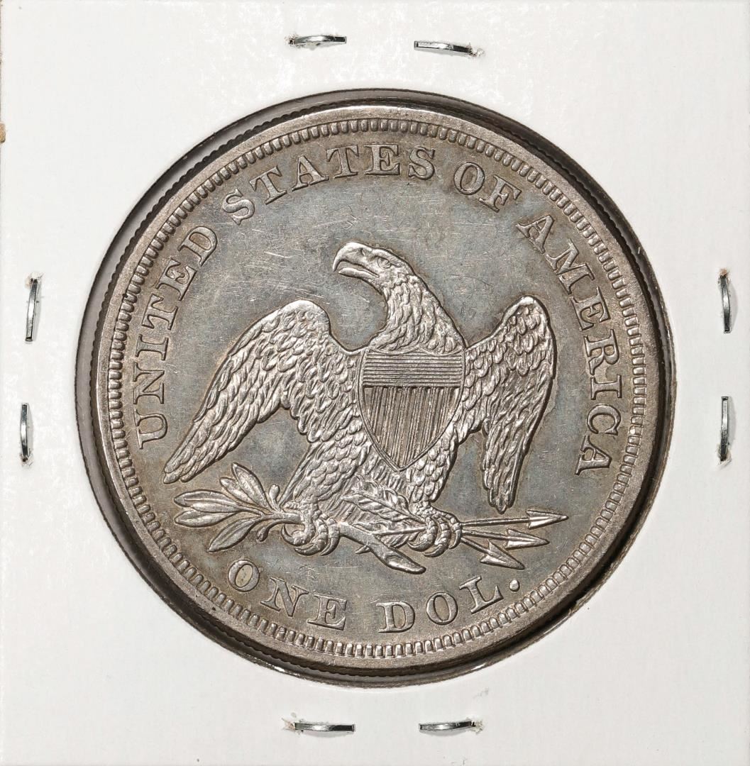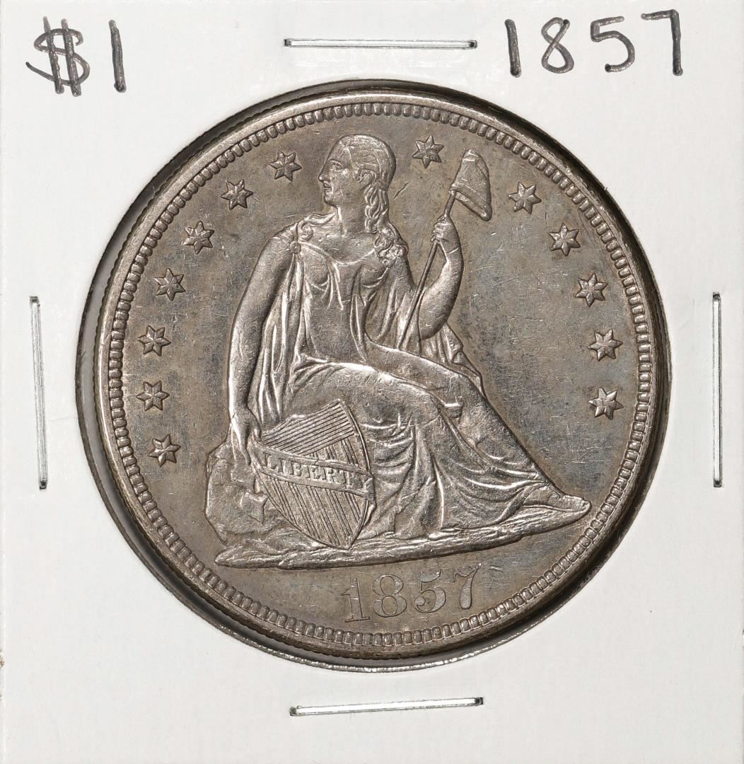 One 1857 $1 Seated Liberty Silver Dollar Coin.