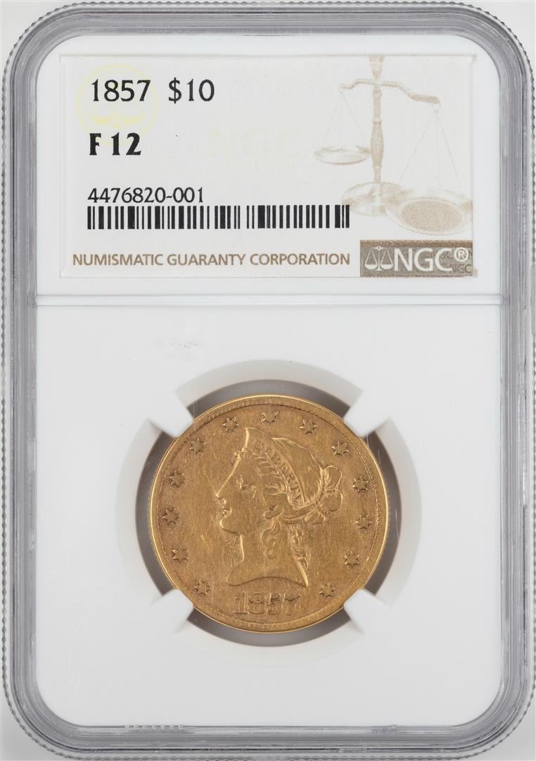 One 1857 $10 Liberty Head Eagle Gold Coin NGC F12. NGC Certified.