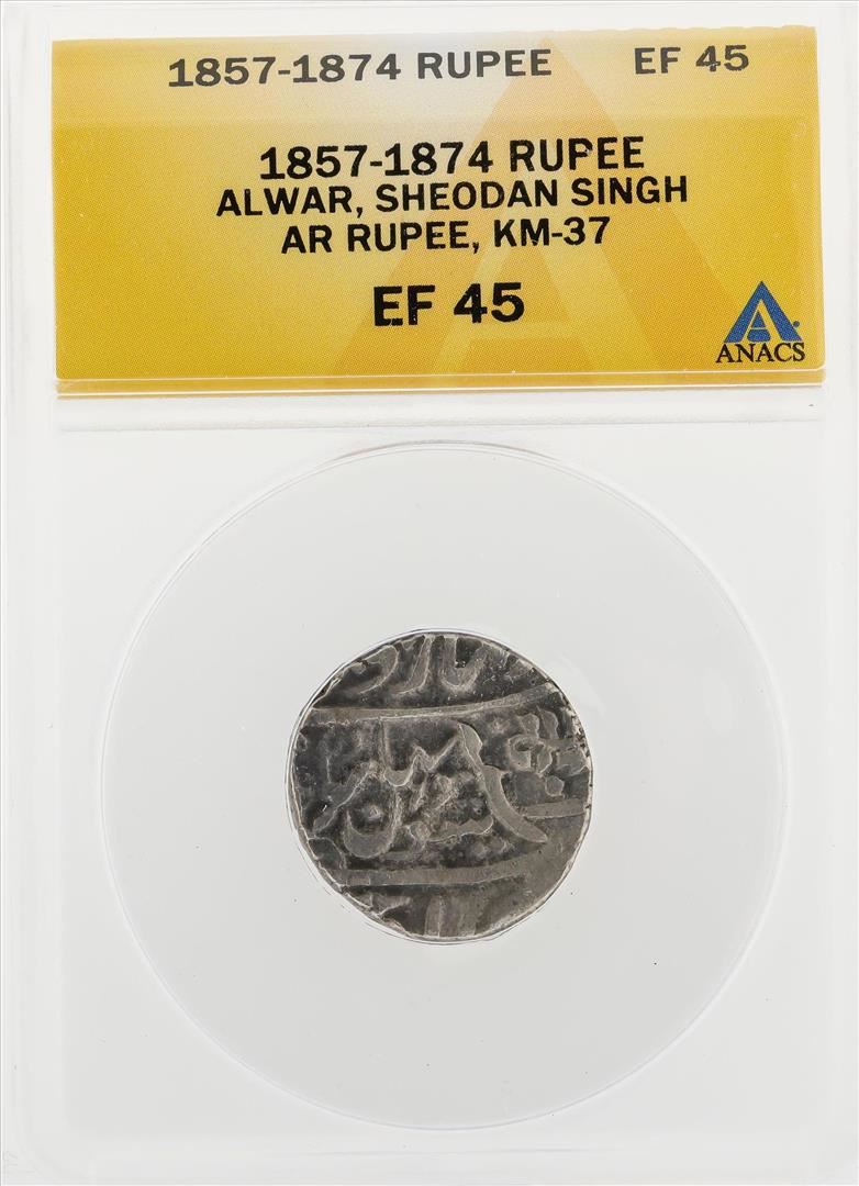 One 1857-1874 Rupee Alwar Sheodan Singh AR KM-37 Coin ANACS EF45. ANACS Certified.
