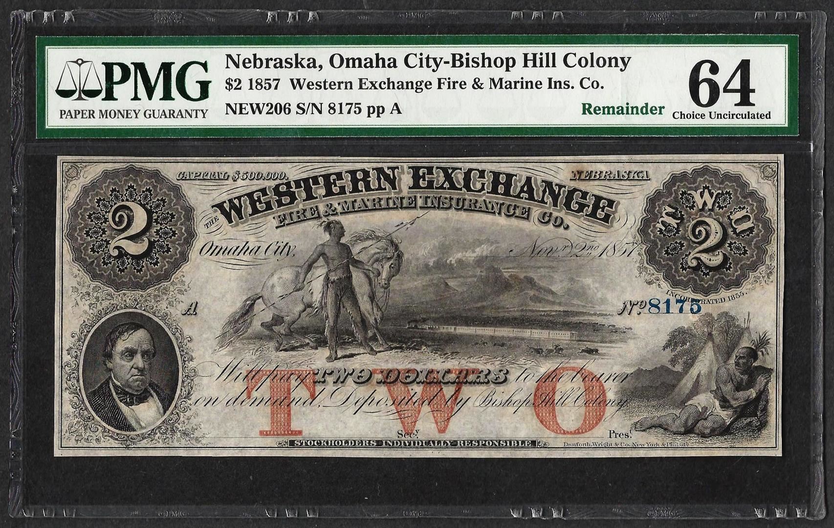 One 1857 $2 Western Exchange Fire & Marine Insurance Co. Note PMG Choice Uncirculated 64. PMG Certified.