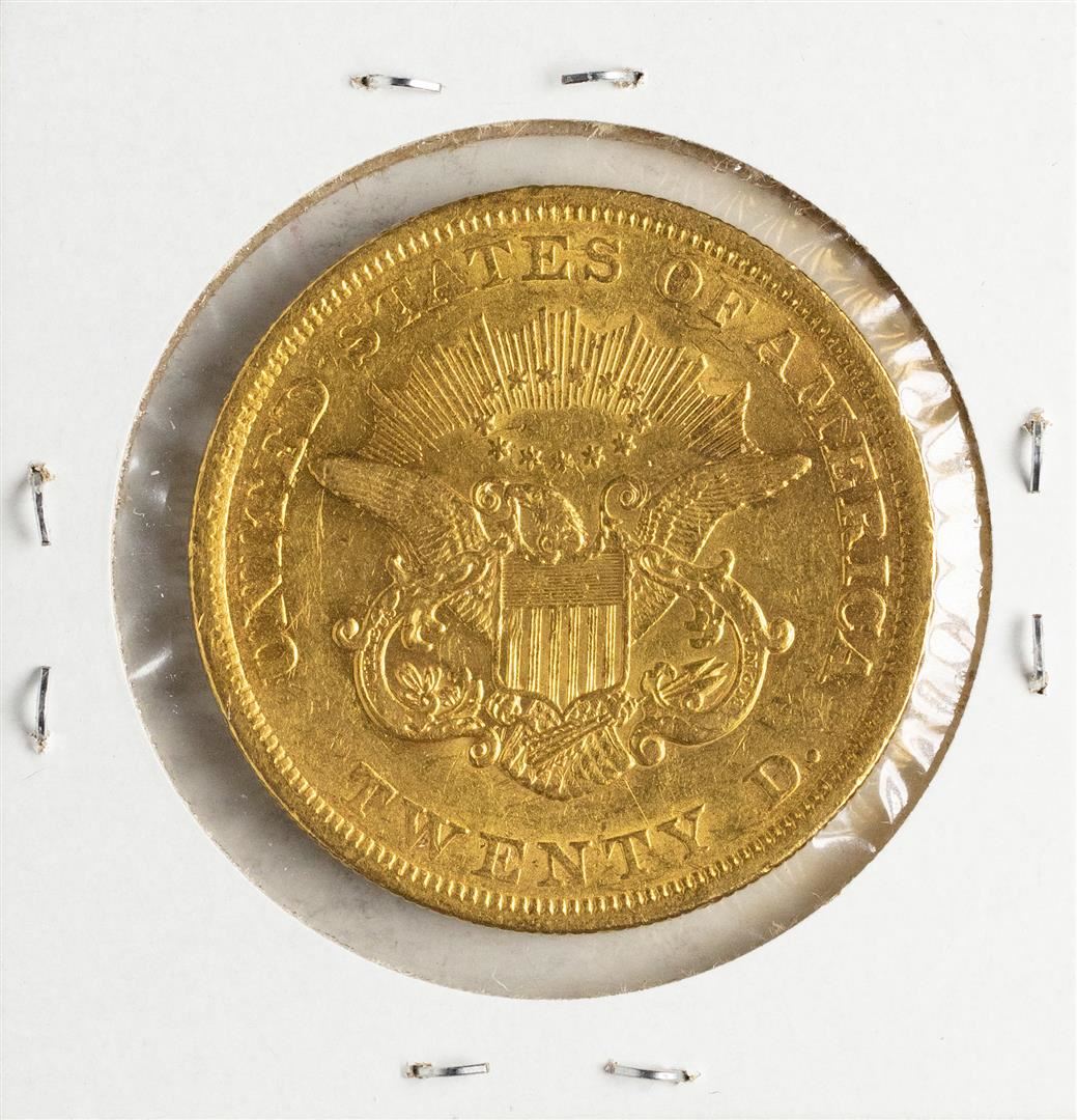 One 1857 $20 Liberty Head Double Eagle Gold Coin.