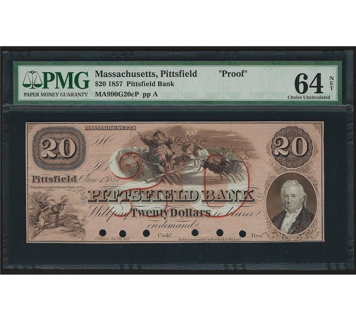 1857 $20 Pittsfield, MA Pittsfield Bank Proof Obsolete Bank Note PMG CU64 Net