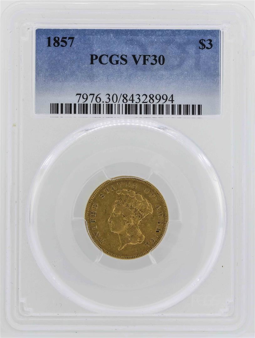 One 1857 $3 Indian Princess Head Gold Coin PCGS VF30. PCGS Graded.