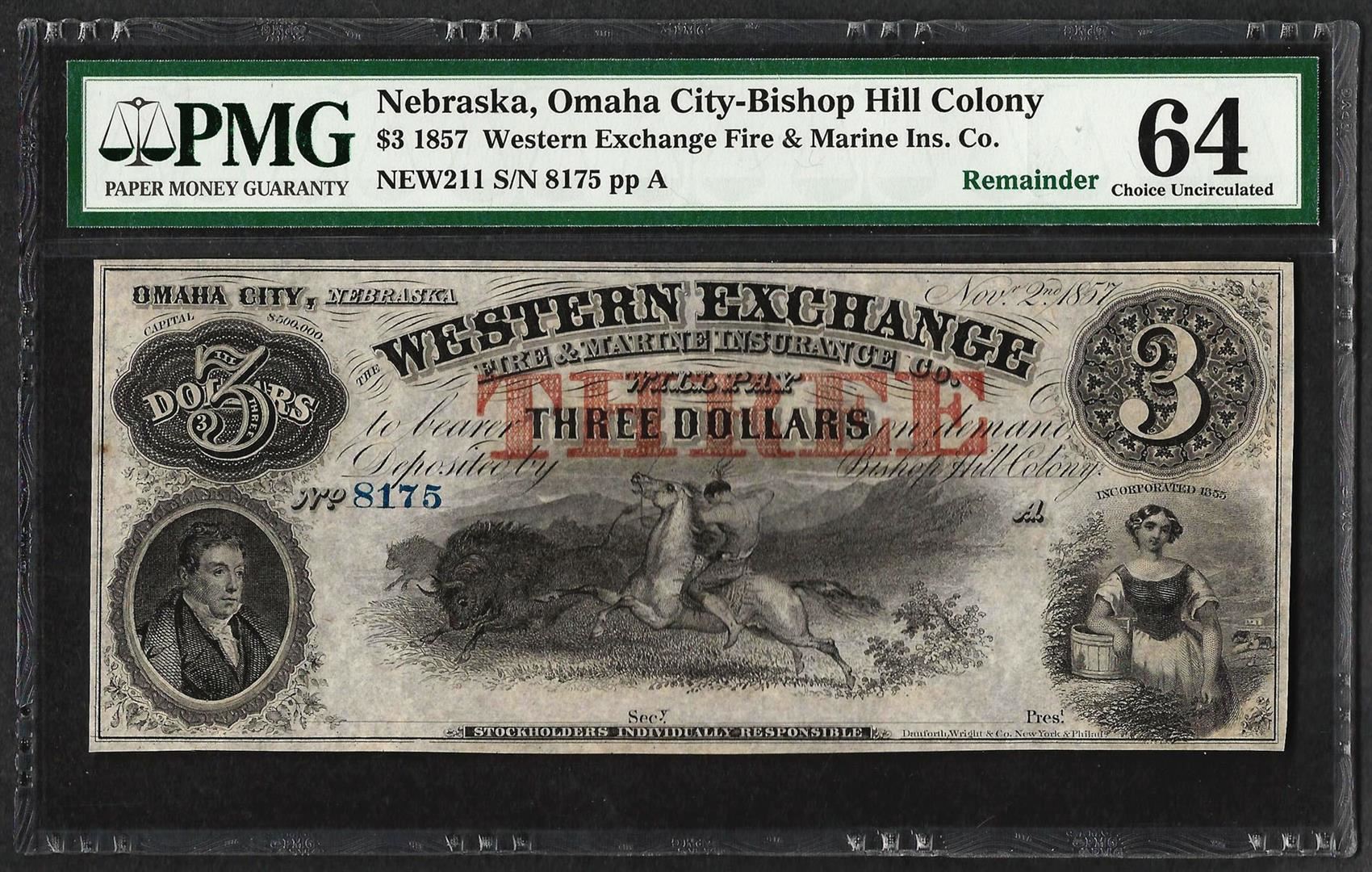 One 1857 $3 Western Exchange Fire & Marine Insurance Co. Note PMG Choice Uncirculated 64. PMG Certified.