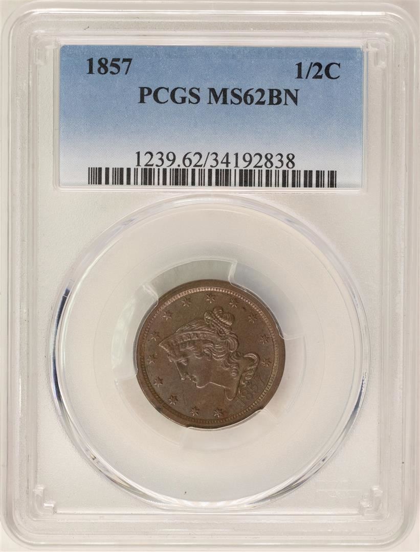 One 1857 Braided Hair Half Cent Coin PCGS MS62BN. PCGS Graded.