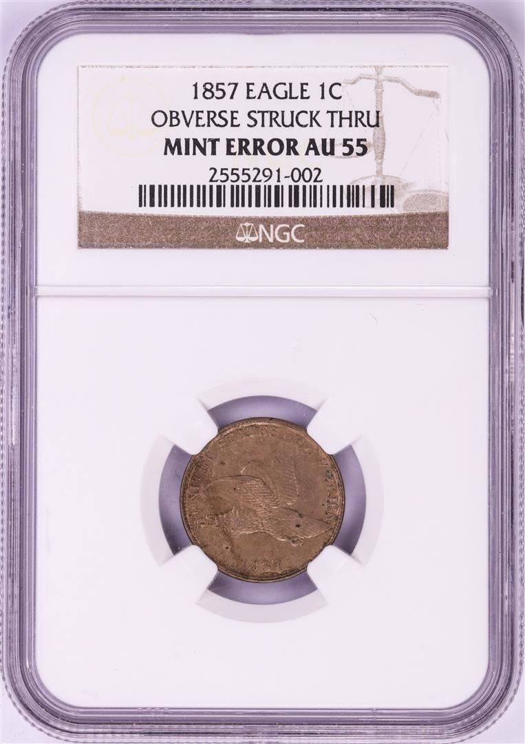 One 1857 Flying Eagle Cent Coin Obverse Struck Thru Mint Error NGC AU55. NGC Certified.