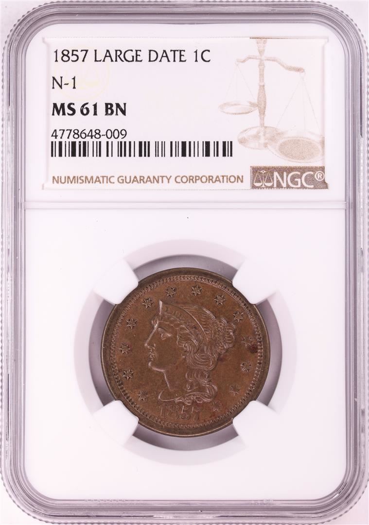 One 1857 Large Date N-1 Braided Hair Cent Coin NGC MS61 BN. NGC Certified.