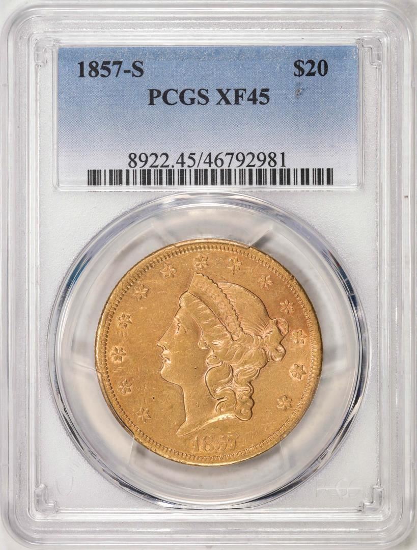 One 1857-S $20 Liberty Head Double Eagle Gold Coin PCGS XF45. PCGS Graded.