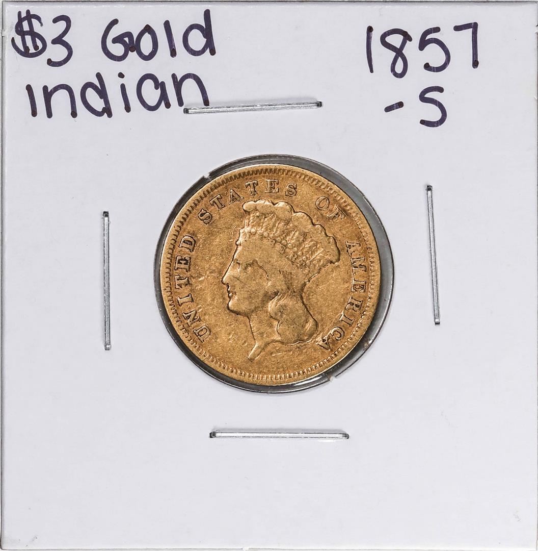 One 1857-S $3 Indian Princess Head Gold Coin.