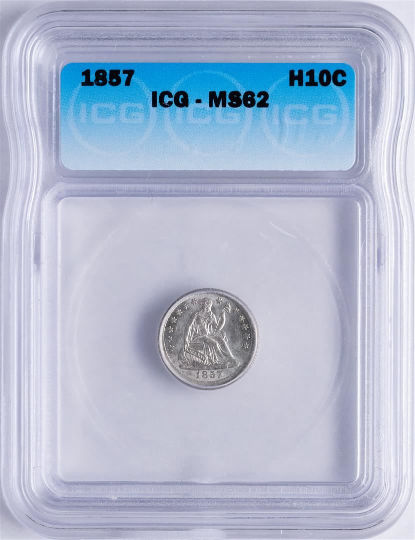 One 1857 Seated Liberty Half Dime Coin ICG MS62. ICG Certified.