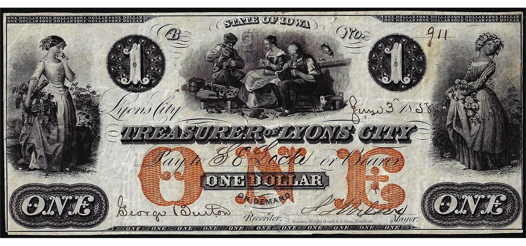 One 1858 $1 Treasurer of Lyons City Iowa Obsolete Note.