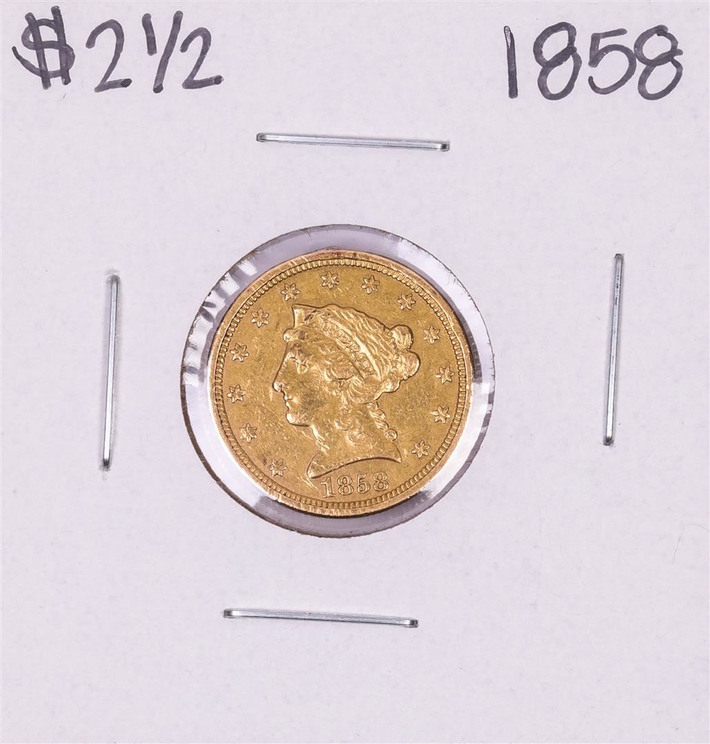 One 1858 $2 1/2 Liberty Head Quarter Eagle Gold Coin, there is a small solder mark at the bottom of the reverse.