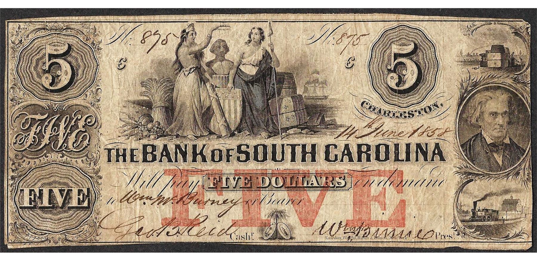 One 1858 $5 Bank of South Carolina Obsolete Note.