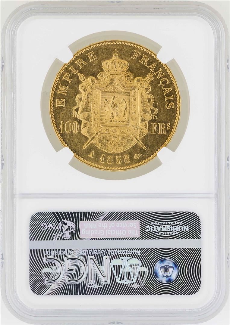 One 1858-A France 100 Francs Gold Coin NGC AU Details. NGC Certified.