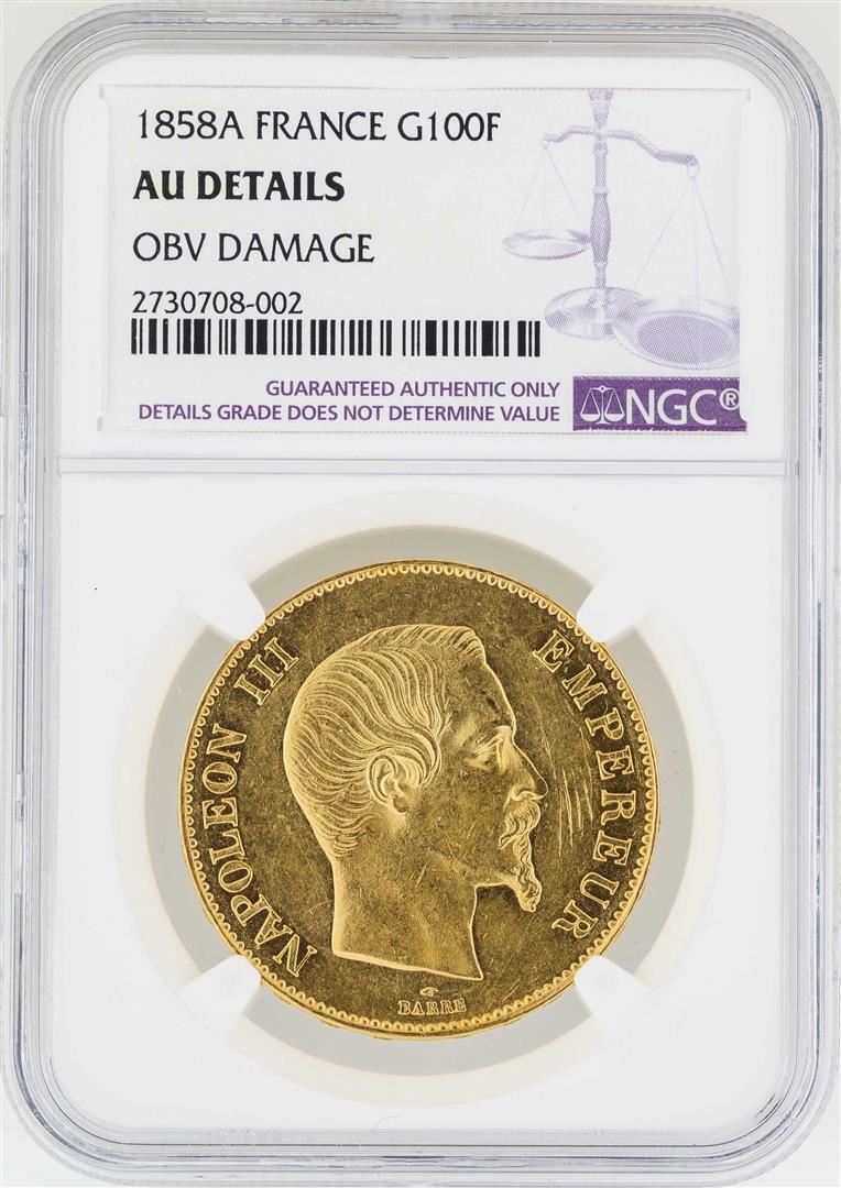 One 1858-A France 100 Francs Gold Coin NGC AU Details. NGC Certified.