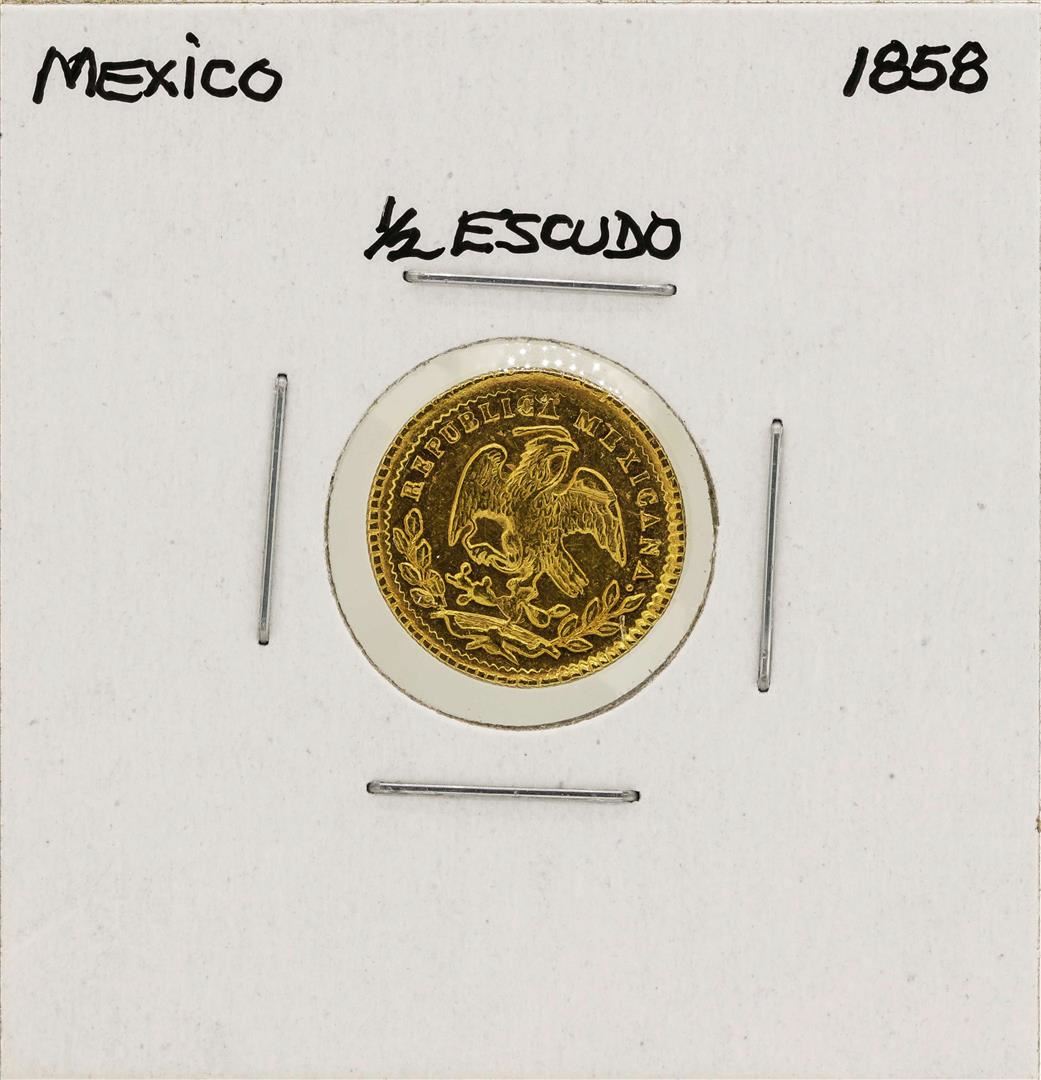 One 1858 Mexico 1/2 Escudo Gold Coin.