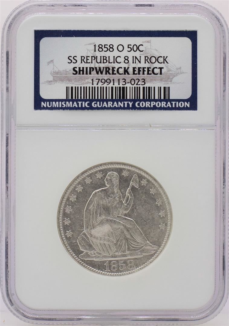 One 1858-O 8 in Rock Seated Liberty Half Dollar Coin NGC Shipwreck Effect w/ Book. NGC Certified.