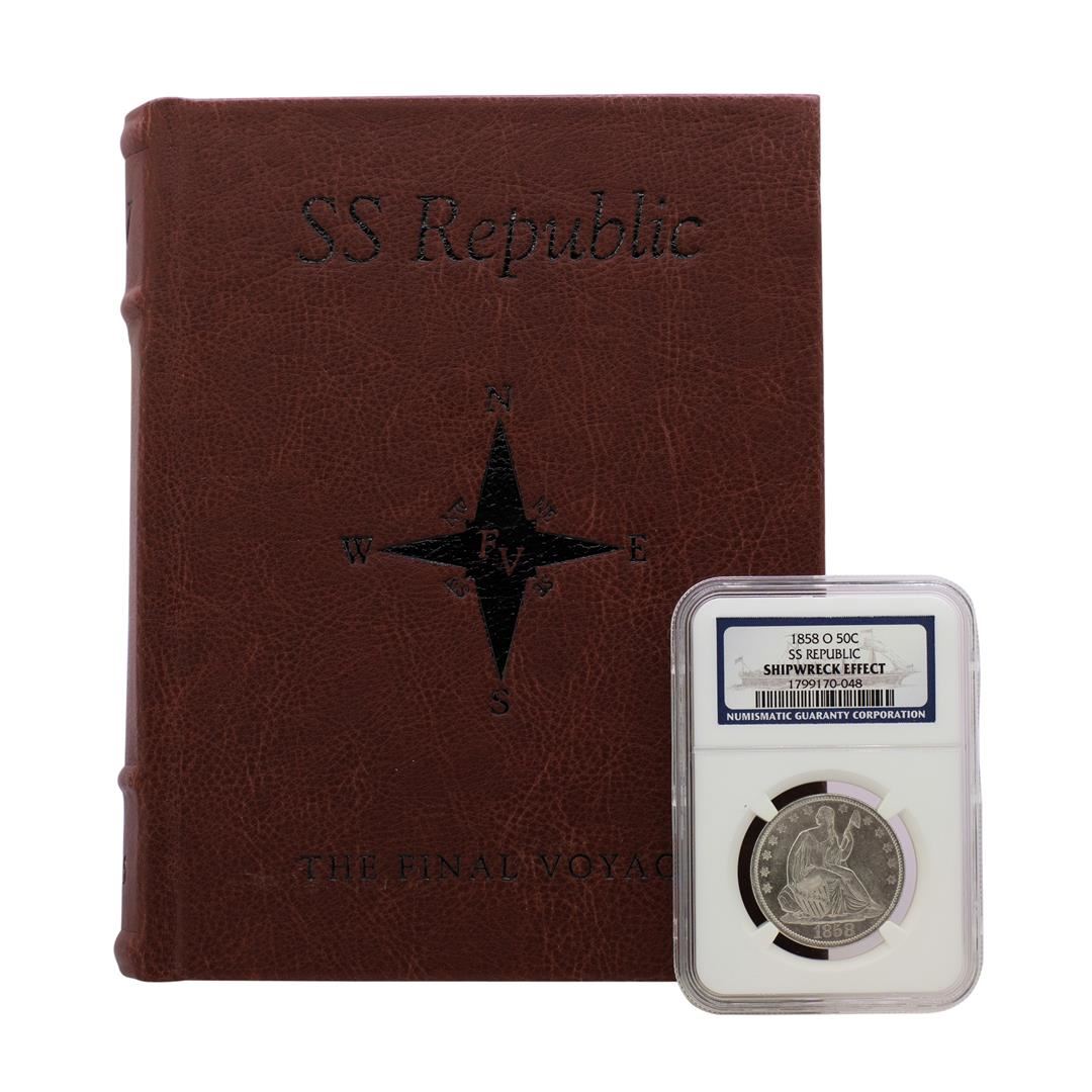1858-O SS Republic Seated Liberty Half Dollar Coin NGC Shipwreck Effect with Book