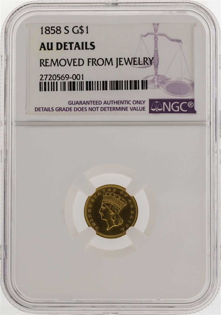 One 1858-S $1 Indian Princess Head Gold Dollar Coin NGC AU Details. NGC Certified.