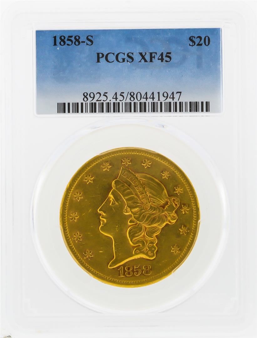 One 1858-S $20 Liberty Head Double Eagle Gold Coin PCGS Graded XF45. PCGS Graded.