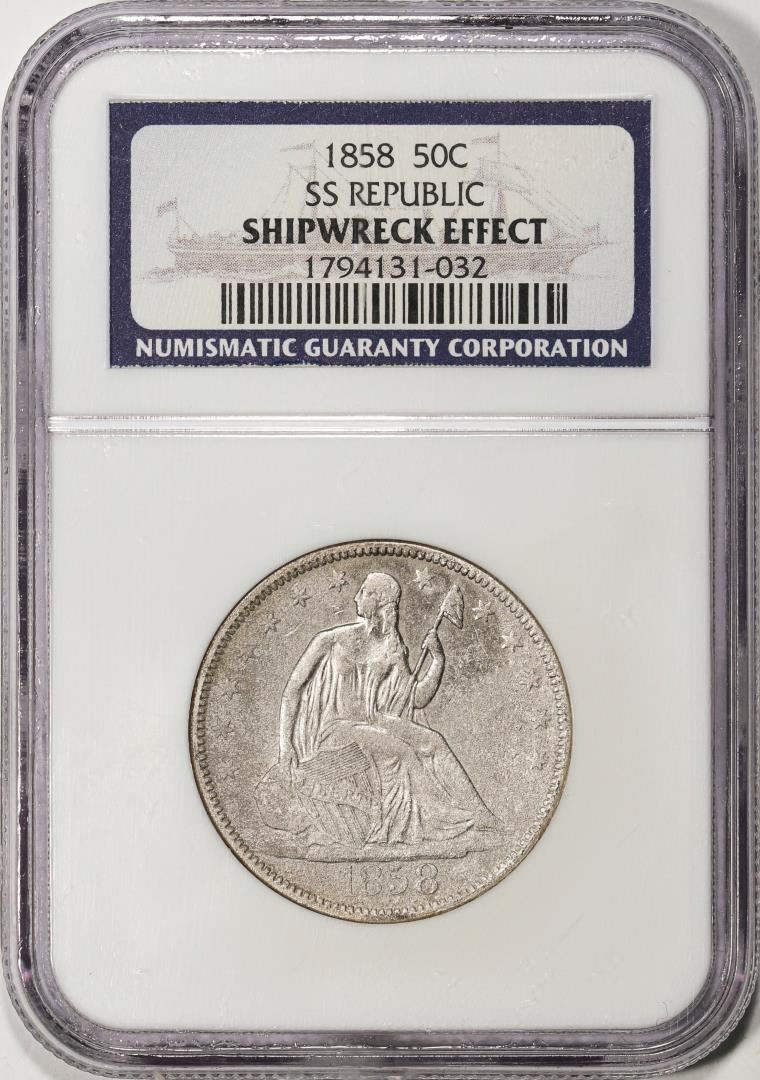 1858 SS Republic Seated Liberty Half Dollar Coin NGC Shipwreck Effect
