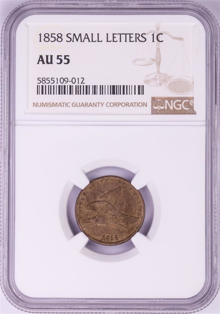 One 1858 Small Letters Flying Eagle Cent Coin NGC AU55. NGC Certified.
