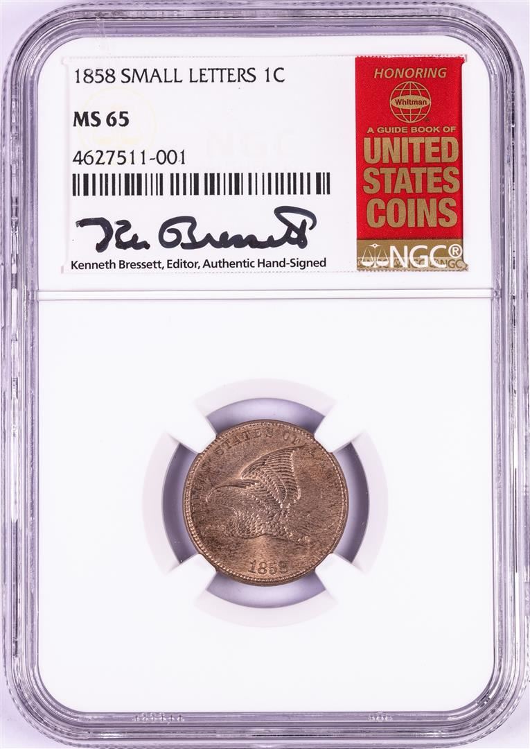 One 1858 Small Letters Flying Eagle Cent Coin NGC MS65 Kenneth Bressett Signature. NGC Certified.