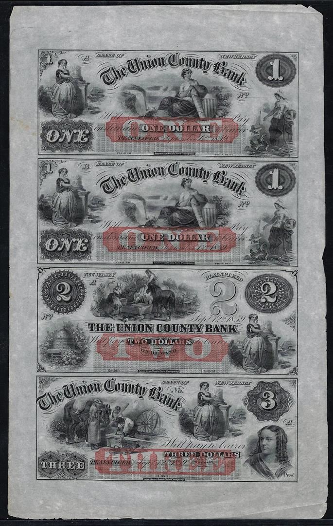 One 1859 $1-$1-$2-$3 Uncut Sheet of The Union County Bank NJ Obsolete Notes.