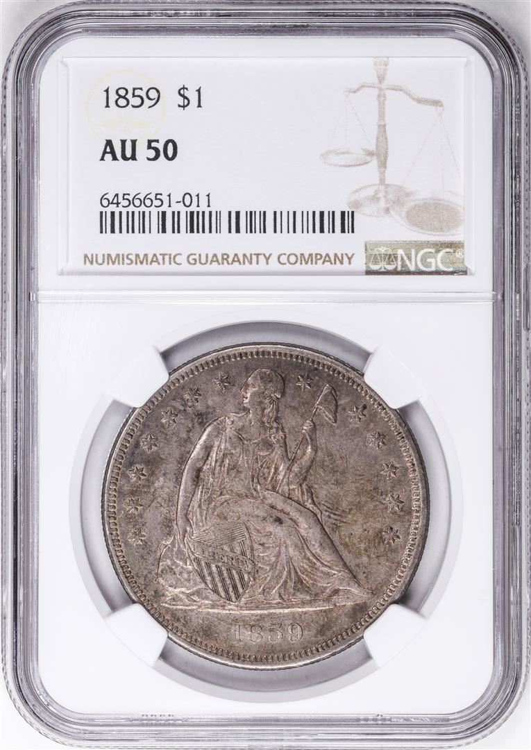 One 1859 $1 Seated Liberty Silver Dollar Coin NGC AU50. NGC Certified.